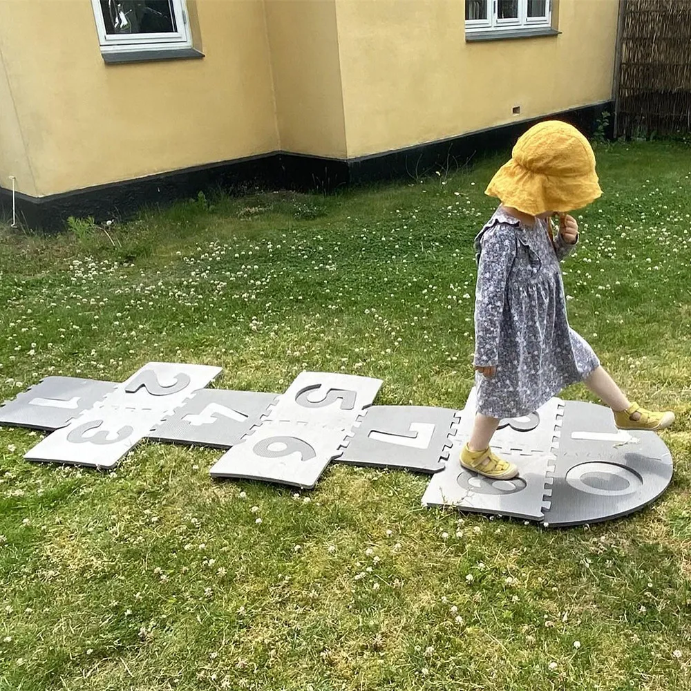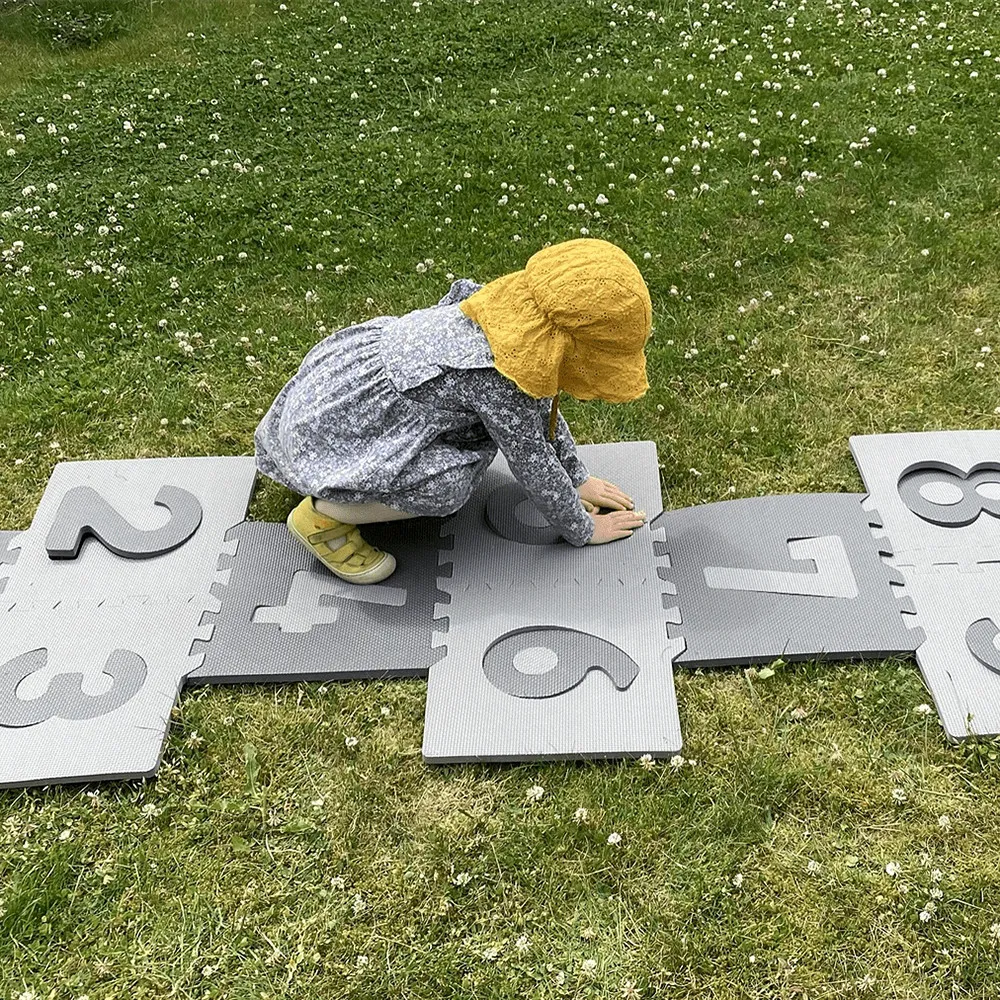 Постелката е тип пъзел – съставена от отделни елементи, които могат да се подреждат по различни начини. Цифрите могат да се изваждат, което позволява на детето да съпоставя числата с отворите в плочките и да упражнява броене от 1 до 10 по забавен и интерактивен начин.