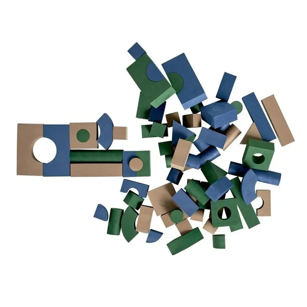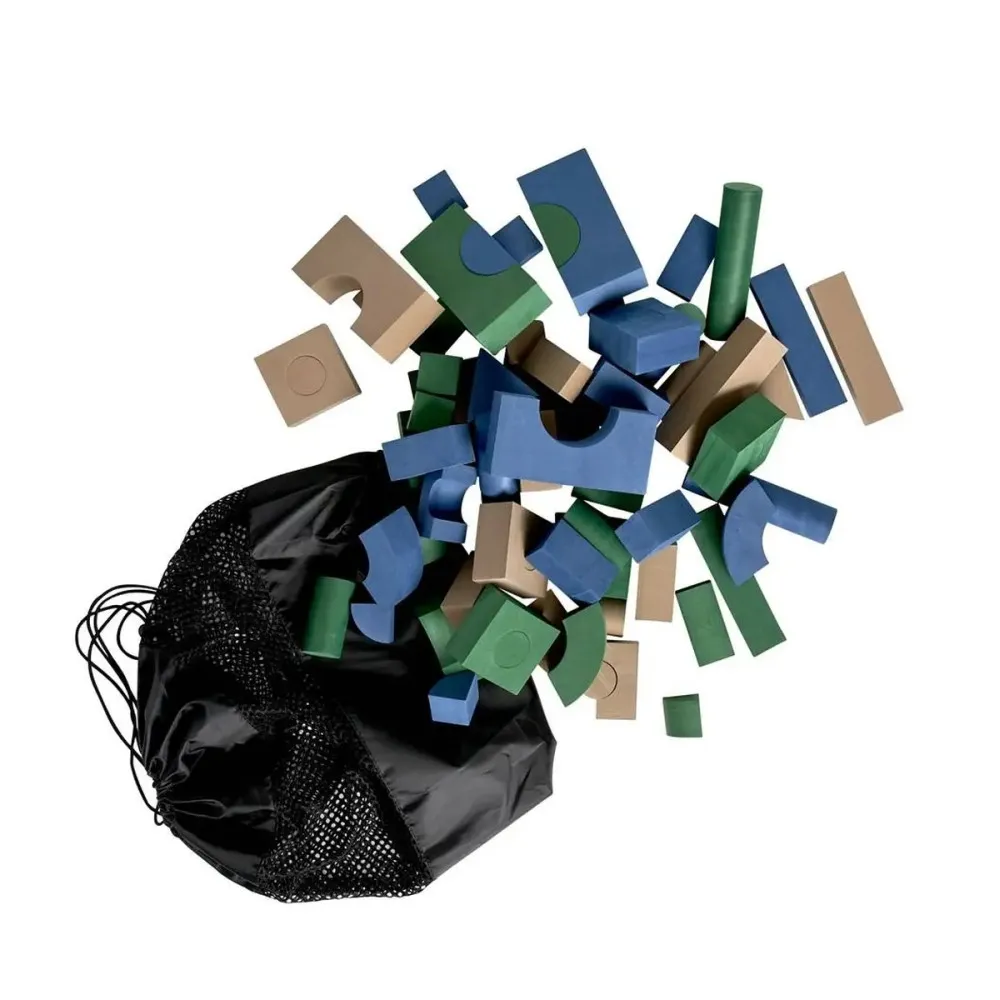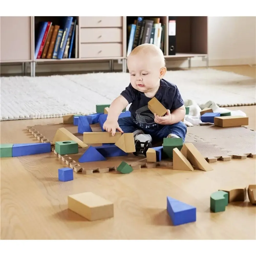 Комплектът включва разнообразни форми, които помагат на детето да разпознава различни цветове и геометрични фигури, докато се забавлява. Блокчетата са изработени от висококачествена мека пяна – същия тип материал, използван при пъзел постелките BabyDan – което ги прави изключително леки и безопасни. Дори при падане или срутване на конструкция няма риск от нараняване.