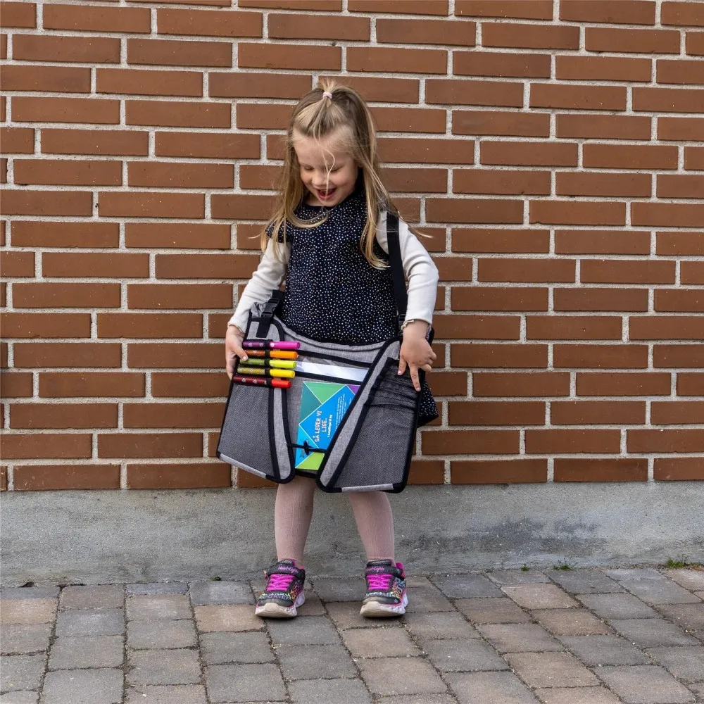 С множество еластични джобове в различни размери, Travel Fun побира всичко необходимо – пастели, маркери, малки книжки, листове за рисуване, играчки и закуски. Големият джоб с цип от долната страна и просторният прозрачен джоб отпред предоставят допълнително място за книги, рисунки и хартия.