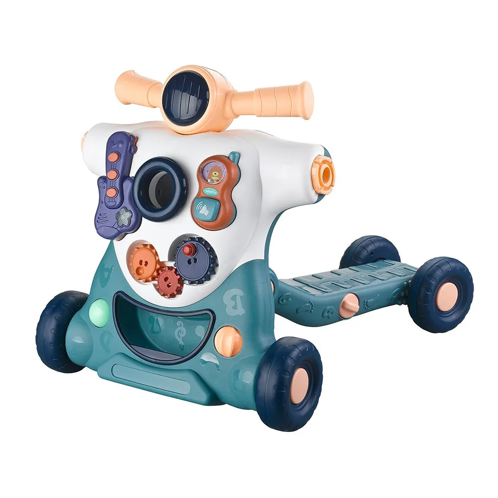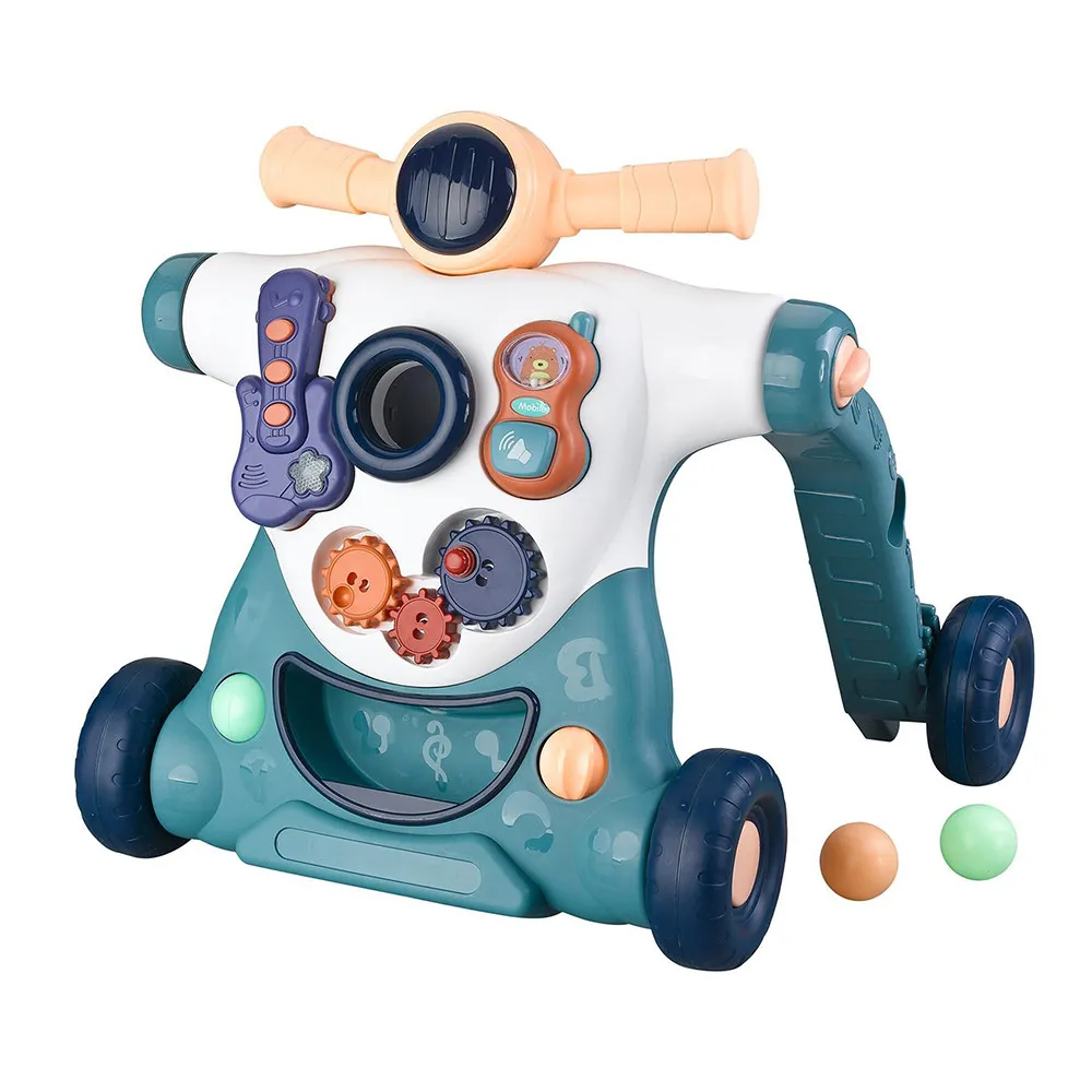 Стабилната конструкция, регулируемата дръжка и гумените колела осигуряват плавно движение и безопасна опора при прохождане. Вграденият център за активности със светлини и музика стимулира сетивата, фината моторика и координацията, а играчките могат да се свалят при нужда.