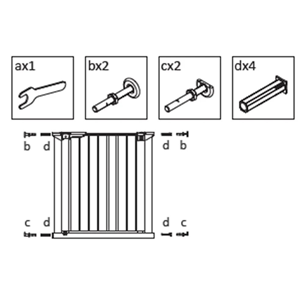 Комплектът съдържа необходимите монтажни елементи за предпазни прегради BabyDan, които се монтират с натягане, като гарантира надеждно закрепване и дълготрайна употреба.