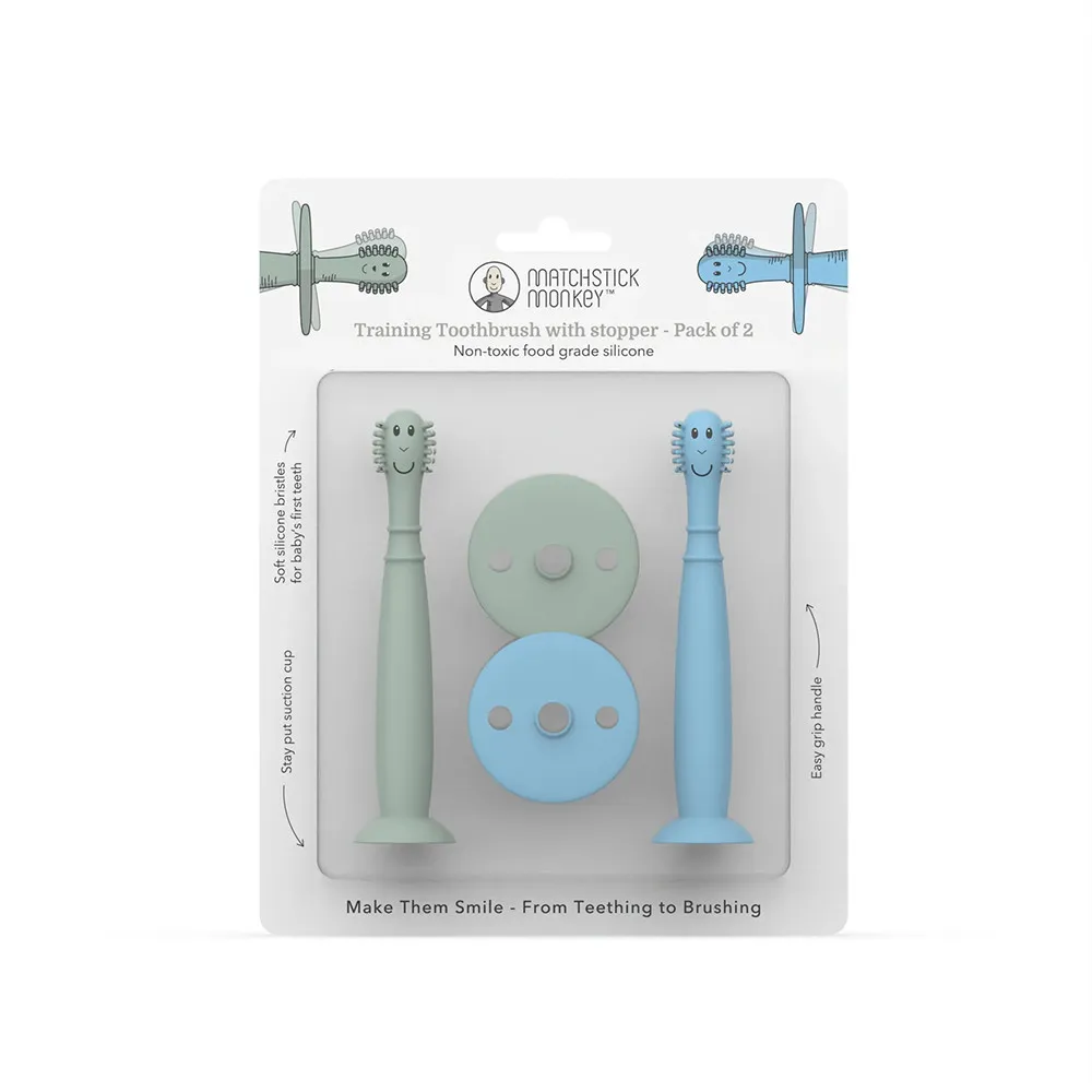Matchstick Monkey 2 броя бебешки четки за зъби със стопер - Mint Green & Light Blue