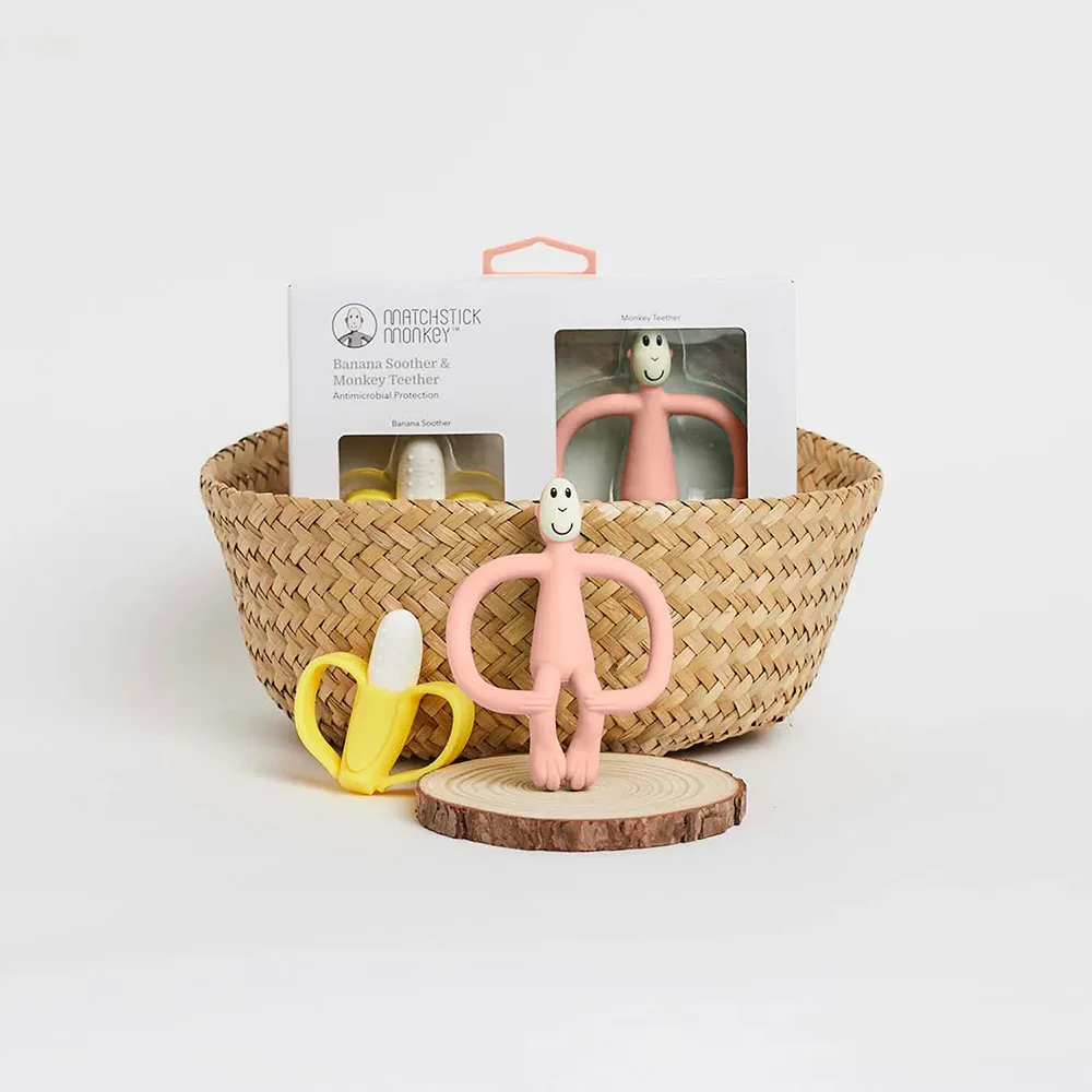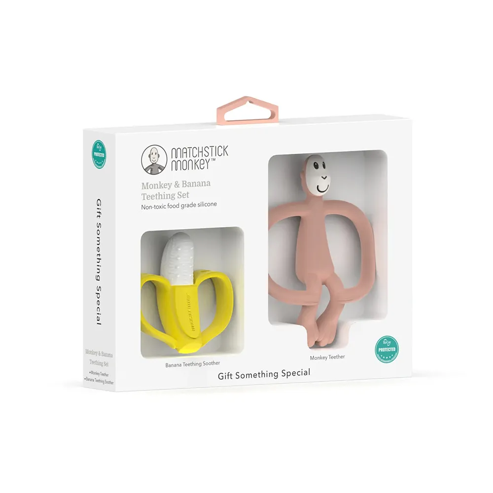 Matchstick Monkey Комплект силиконови чесалки BioCote® - Банан и Маймуна Dusty Pink