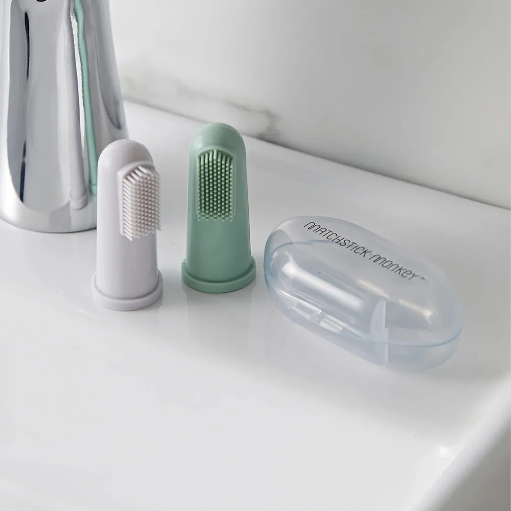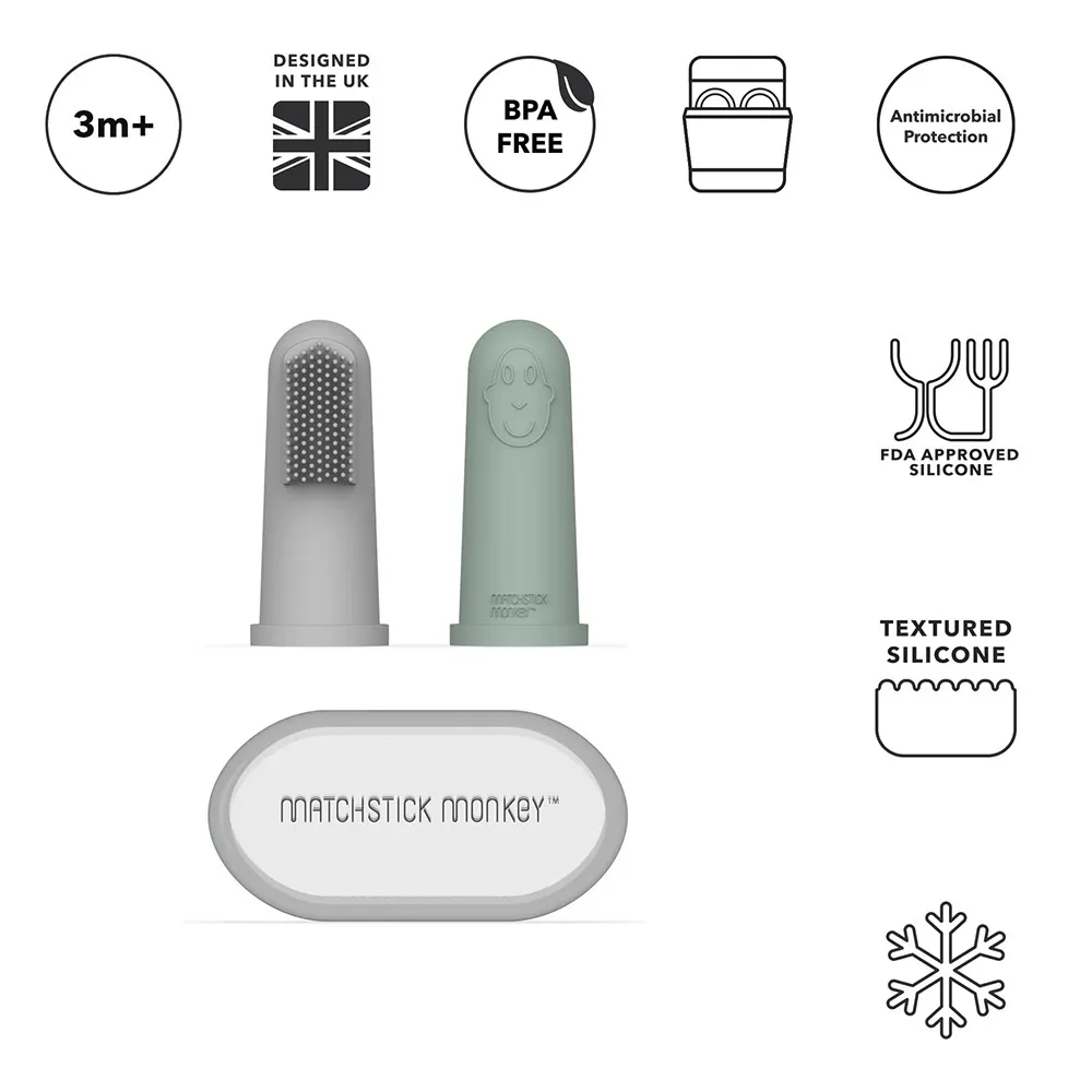 Matchstick Monkey Finger Toothbrush е създадена специално за бебета в периода на никнене на зъбки. Меките силиконови косъмчета успокояват и масажират венците, като същевременно въвеждат бебето в първите стъпки на оралната хигиена. Благодарение на удобния калъф, четките са лесни за съхранение и хигиенична употреба дори по време на път.