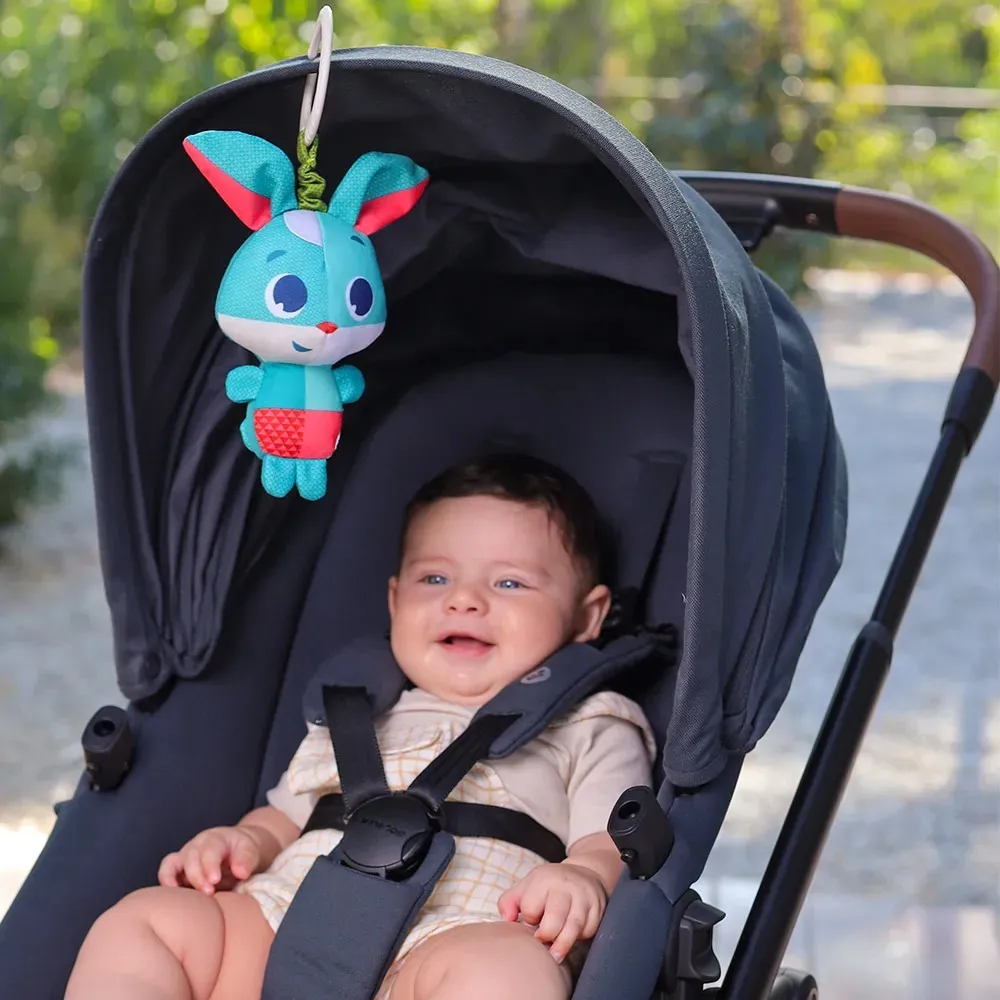 Издава приятен потракващ звук, а въртящата се топка и текстурираната опашка стимулират изследването и укрепват мускулите на ръцете и пръстите. Удобна за хващане и напълно подходяща за гризане. - Вибрираща играчка Зайче Томас