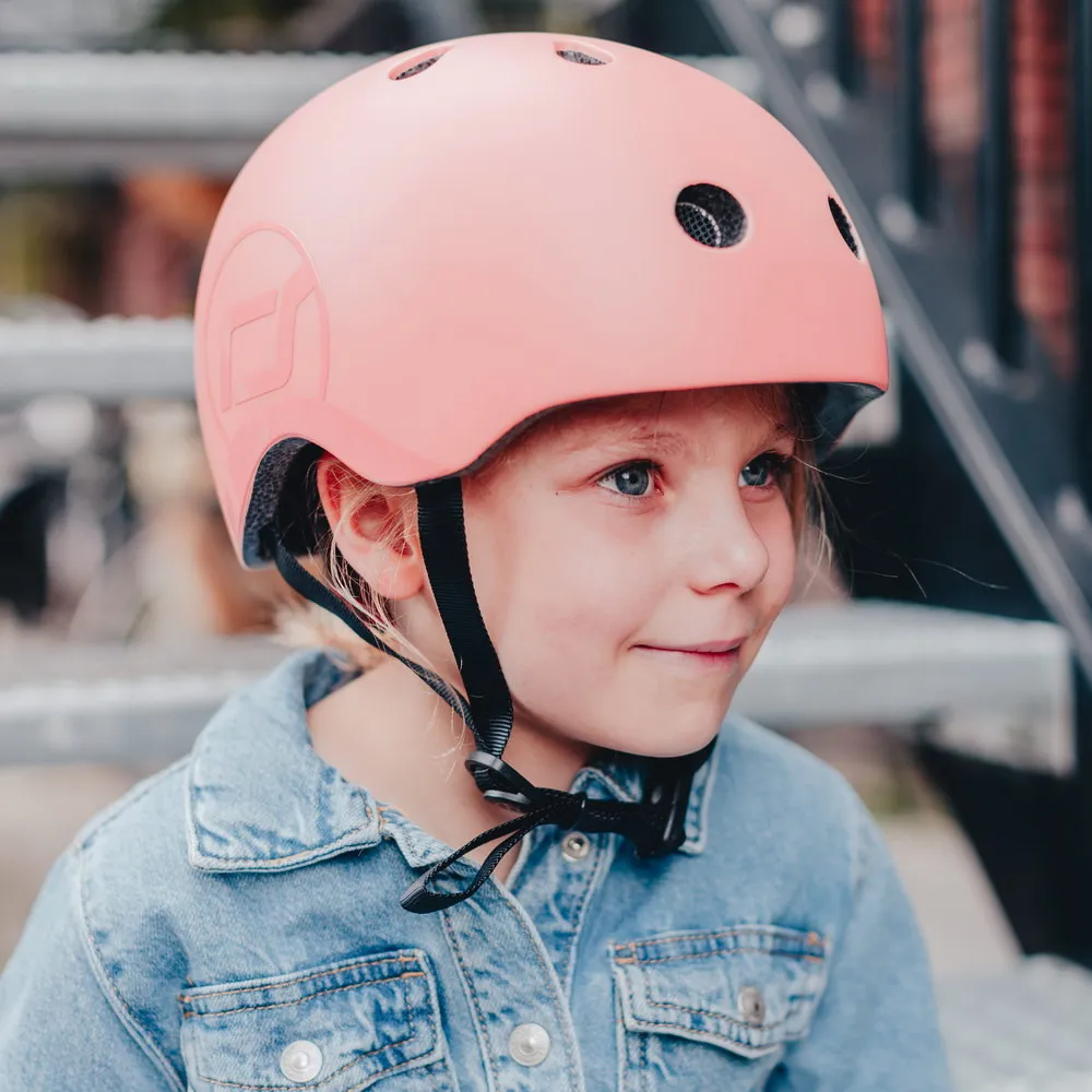 Каските на Scoot & Ride осигуряват максимална защита и комфорт на детето, комбинирани с модерен дизайн. Благодарение на иновативната магнитна закопчалка, каската се закопчава сигурно и лесно – дори от самото дете. Меката подложка под брадичката предпазва кожата от протриване, осигурявайки допълнителен комфорт при носене.