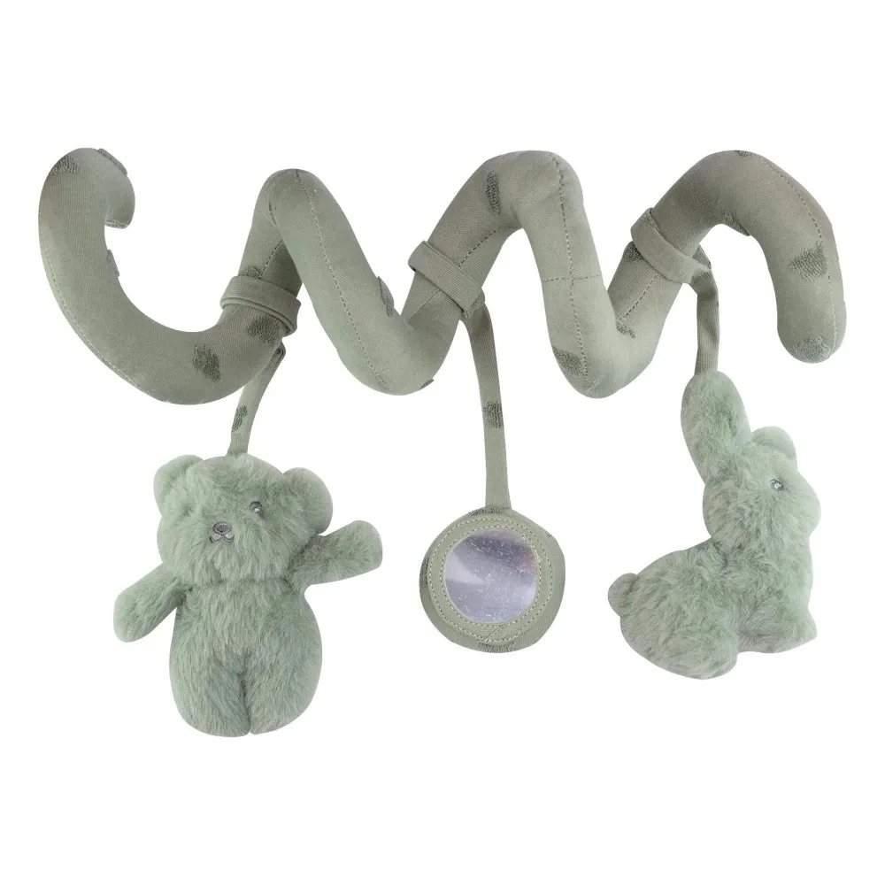 Спиралата включва няколко висящи играчки – плюшен заек, меченце и безопасно огледалце, които насърчават визуалното и тактилното развитие, както и координацията между очите и ръцете.