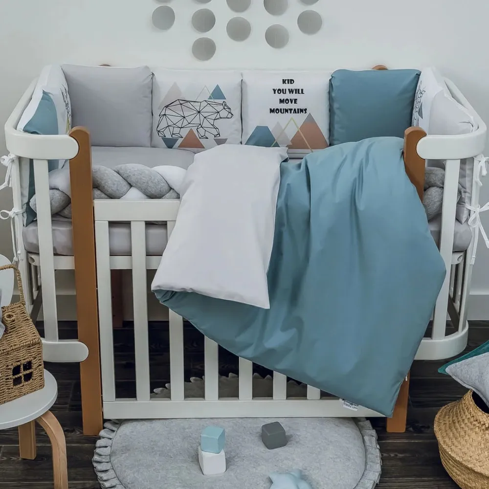 - 100% памучен поплин – използван за плика за завивка, калъфката и чаршафа. Материята е мека, дишаща и изключително щадяща бебешката кожа.