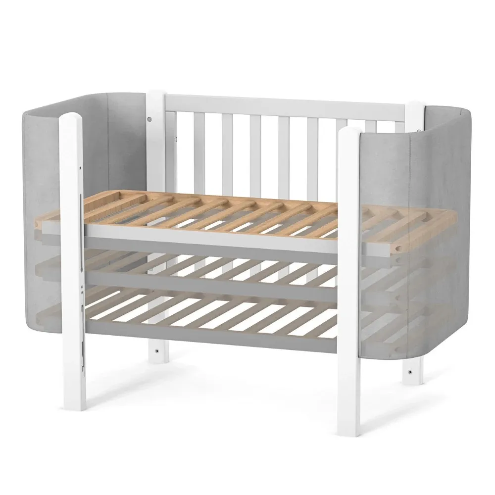 Подвижната странична стена се спуска плавно и е оборудвана с надеждна заключваща система, която не позволява на детето да я управлява самостоятелно. Дори при спуснат панел, всички механизми остават напълно скрити.