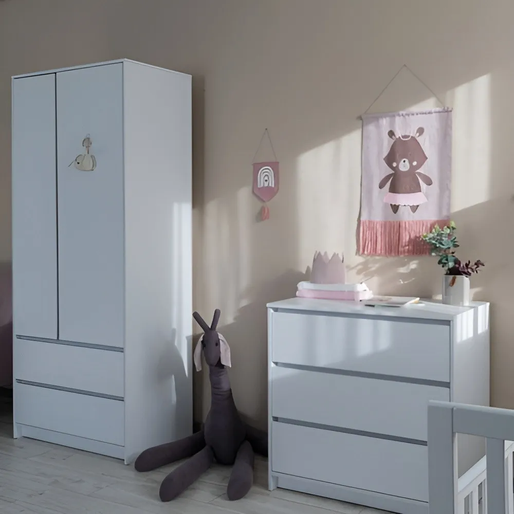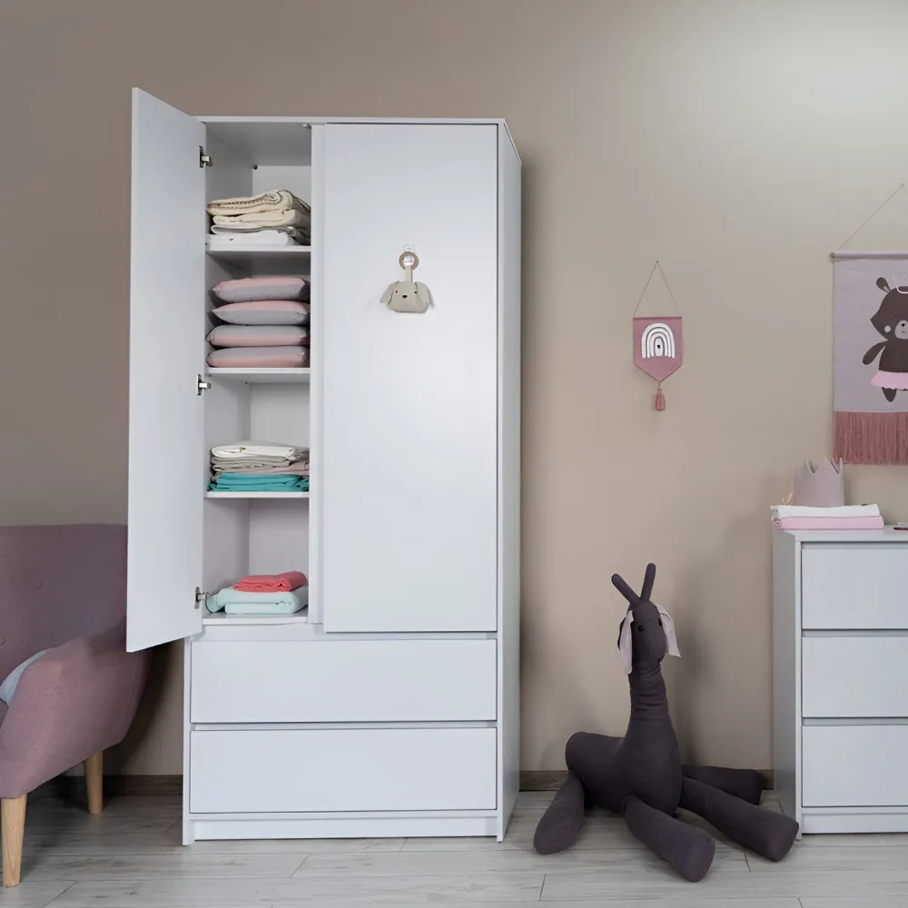 Моделът разполага с две врати, две чекмеджета и комбинация от рафтове и пръти за закачалки, които позволяват вертикално и хоризонтално съхранение. Универсалният му дизайн го прави подходящ за всяка детска стая – както за момче, така и за момиче.